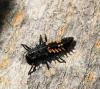 Fourth-instar larva: black, with thick dorsal spines coming from each tubercle, each branching at the top into three prongs; bright orange upside-down L-shaped marking on each side, made from middle tubercles of abdominal segments one to five and inner tubercles of abdominal segment one; two pairs of orange dots on dorsal surface, made from inner tubercles of abdominal segments four and five. Pupa: orange, with pairs of black squarish markings running down the second thoracic segment and abdominal segments two to six; remains of shed spiky larval skin visible at base of pupa.